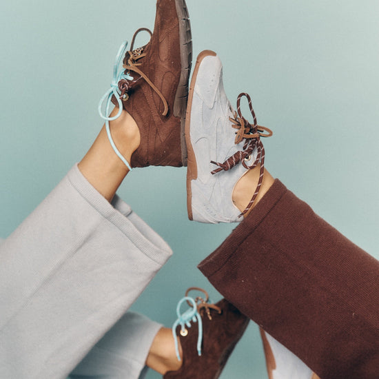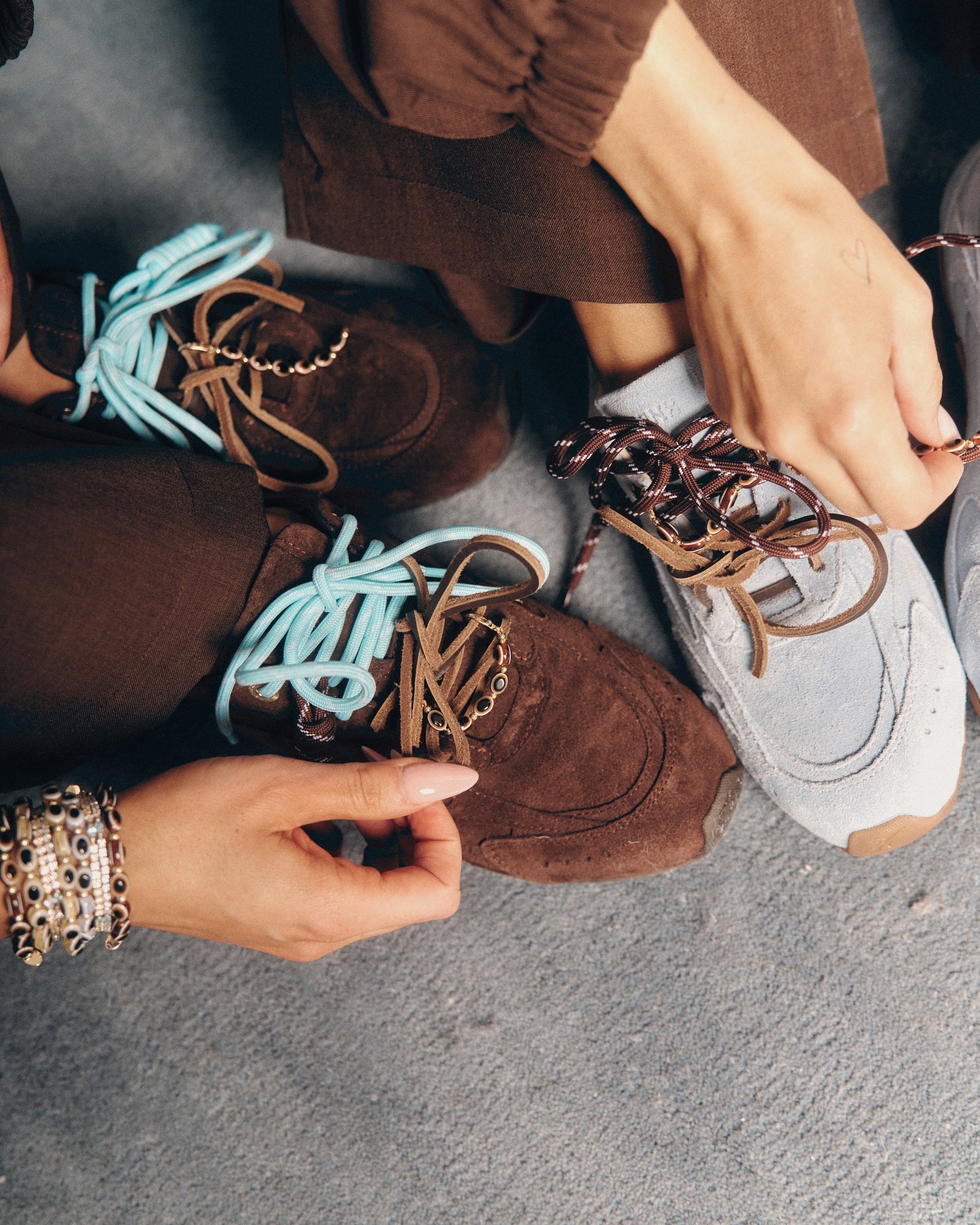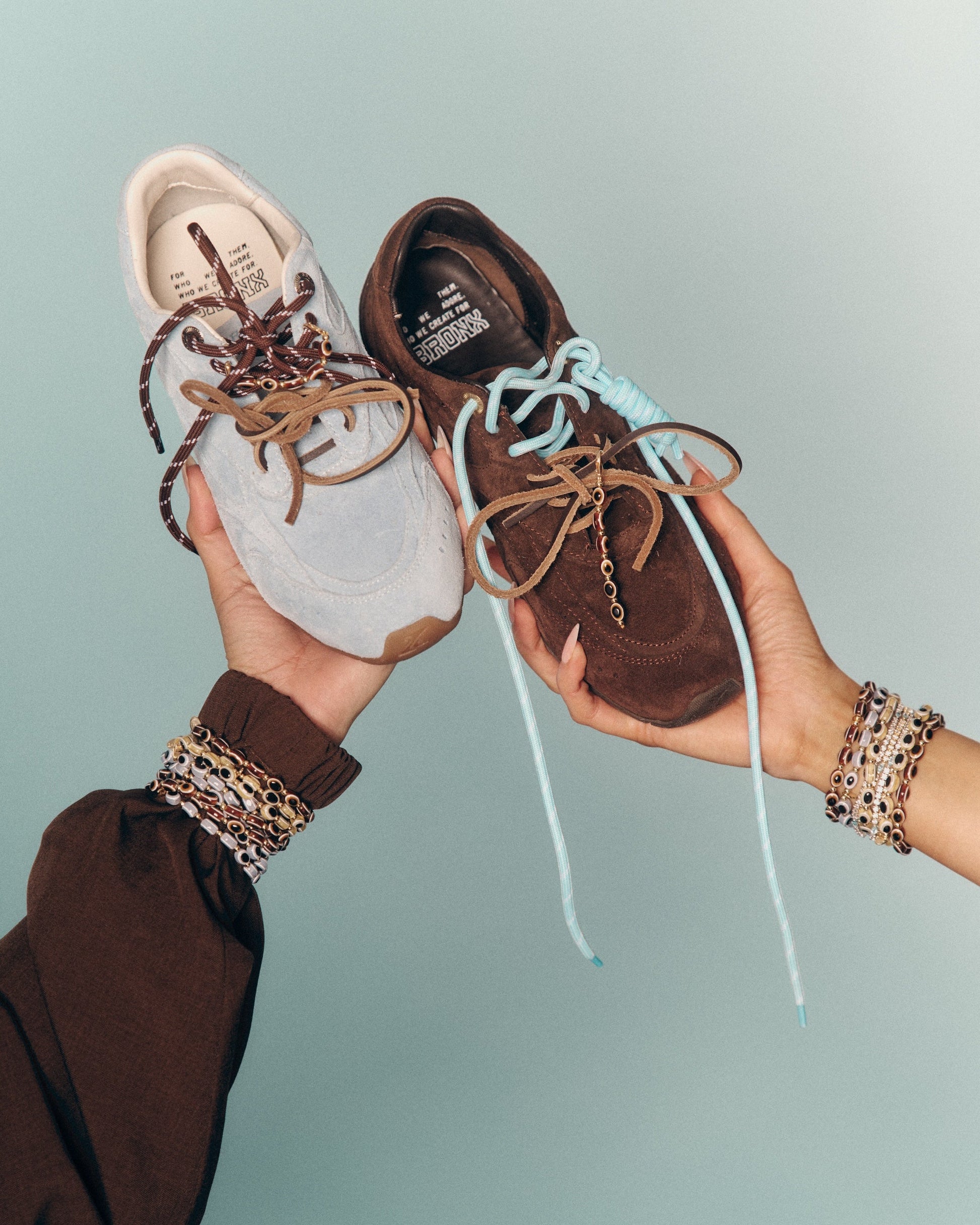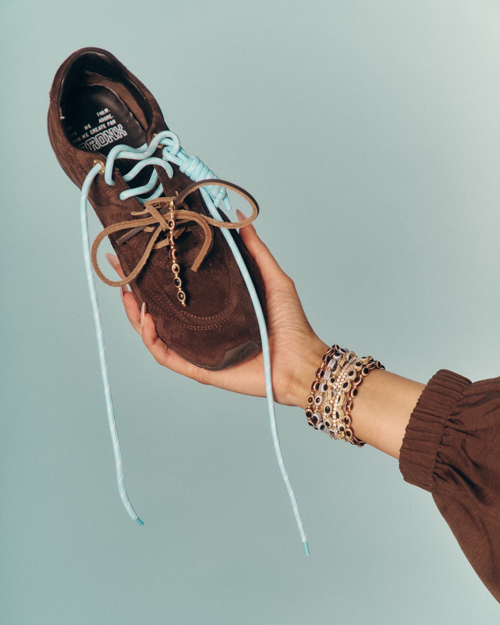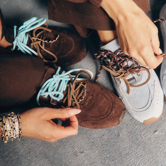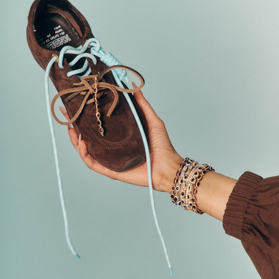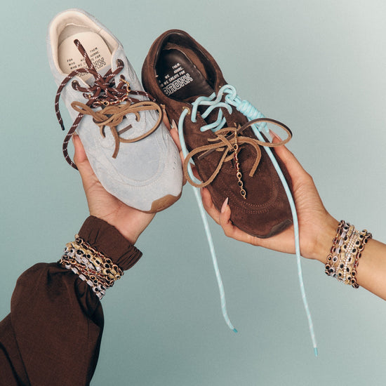 This set includes 1 of each of our Faves Blue and Brown two-tone cord laces, a pair of dark brown leather laces, plus two cord charms and a clip-on brown evil eye bead strand designed to sit perfectly on the lace — adding protection and personality to every step.